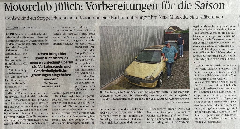 Im Sommer diesen Jahres haben wir uns über einen Artikel in der Jülicher Zeitung erfreuen dürfen, in der wir einen Ausblick auf das – leider wetterbedingt ausgefallene – Stoppelfeldrennen sowie die Nachtorientierungsfahrt gegeben haben.